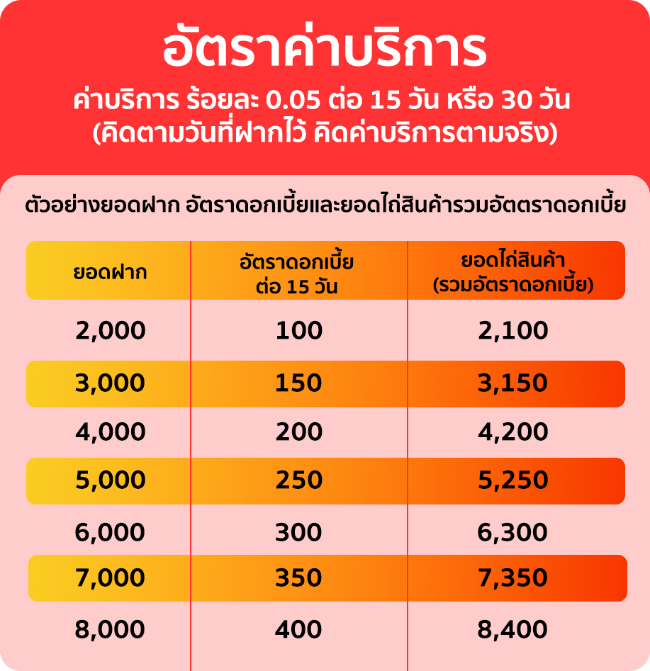 ค่าบริการ ร้อยละ 0.05 ต่อ 15 วัน หรือ 30 วัน (คิดตามวันที่ฝากไว้ คิดค่าบริการตามจริง)